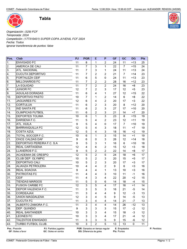 COMET - Federación Colombiana de Fútbol - Tabla Página: 1 / 2