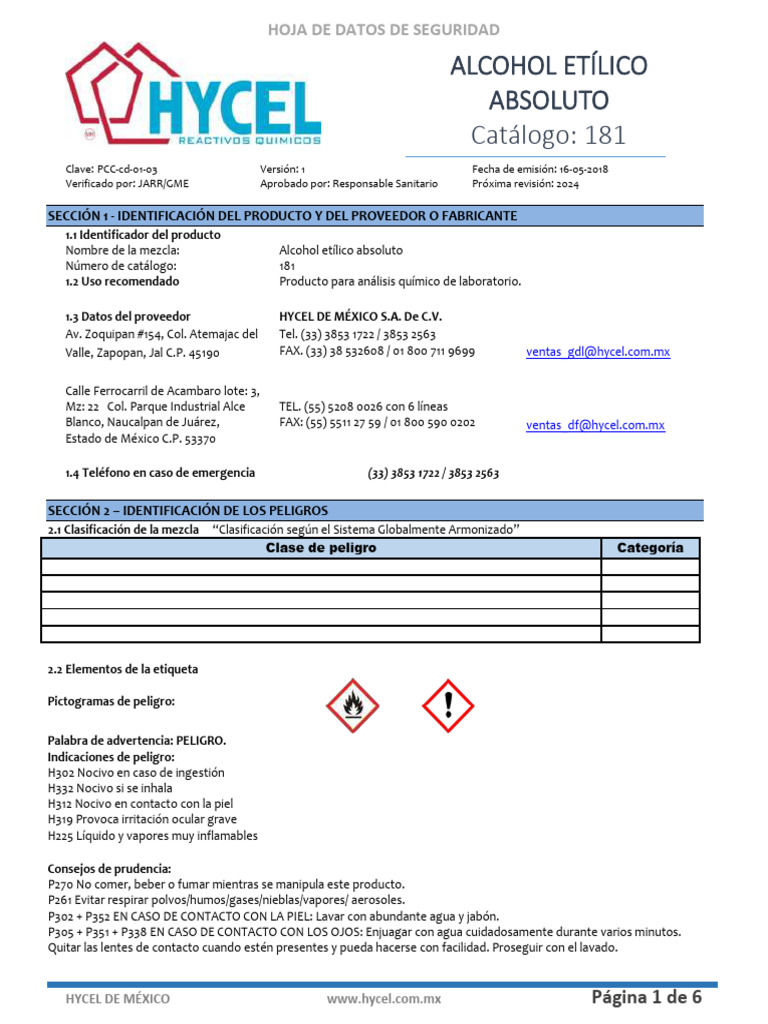 ALCOHOL ETÍLICO ABSOLUTO HOJA DE DATOS DE SEGURIDAD CATÁLOGO 181