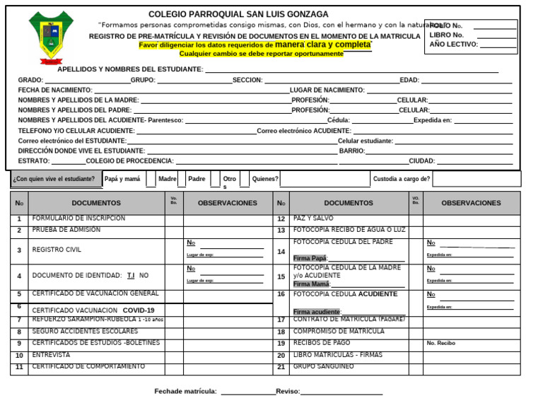 Favor diligenciar los datos requeridos de manera clara y completa AÑO LECTIVO: