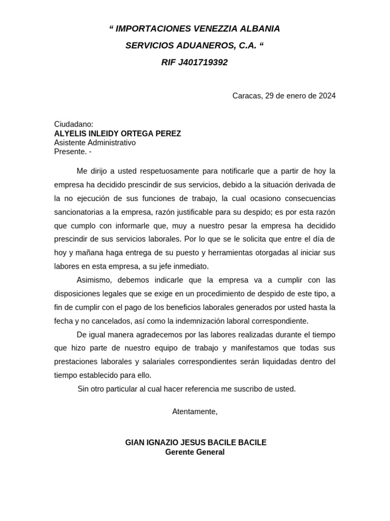 prescindir de sus servicios laborales. Por lo que se le solicita que entre el día de