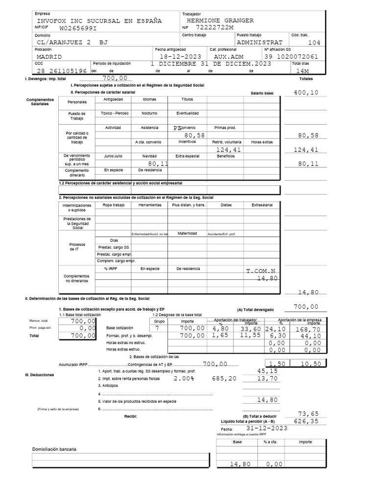 Remun. total 700,00 Grupo Importe Aportación del trabajador