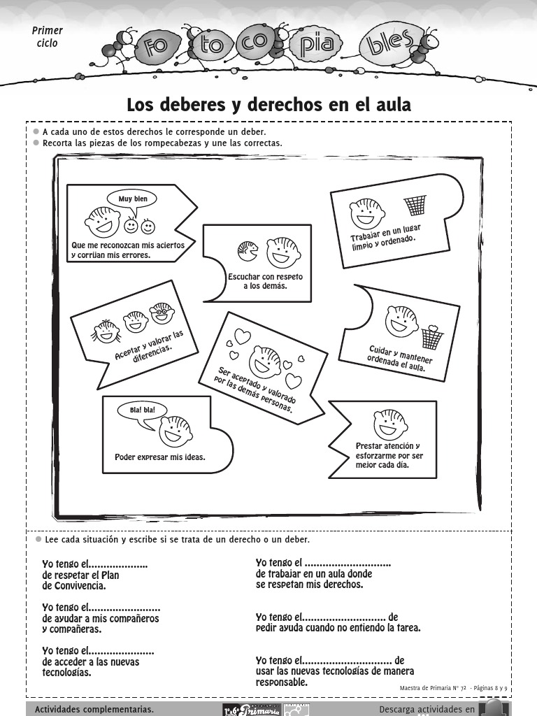 A cada uno de estos derechos le corresponde un deber. Recorta las piezas de los rompecabezas y une las correctas.
