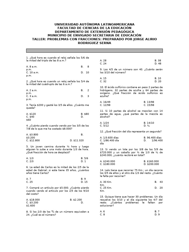 TALLER: PROBLEMAS CON FRACCIONES: PREPARADO POR JORGE ALIRIO RODRIGUEZ