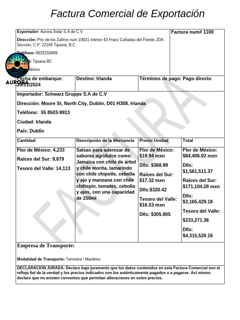 Exportador: Aurora Solar S.A de C.V Factura num# 1100