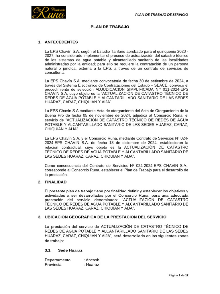 corresponde al Consorcio Runa, establecer el Plan de Trabajo para el desarrollo de