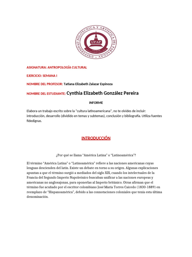 Elabora un trabajo escrito sobre la “cultura latinoamericana”, no te olvides de incluir: