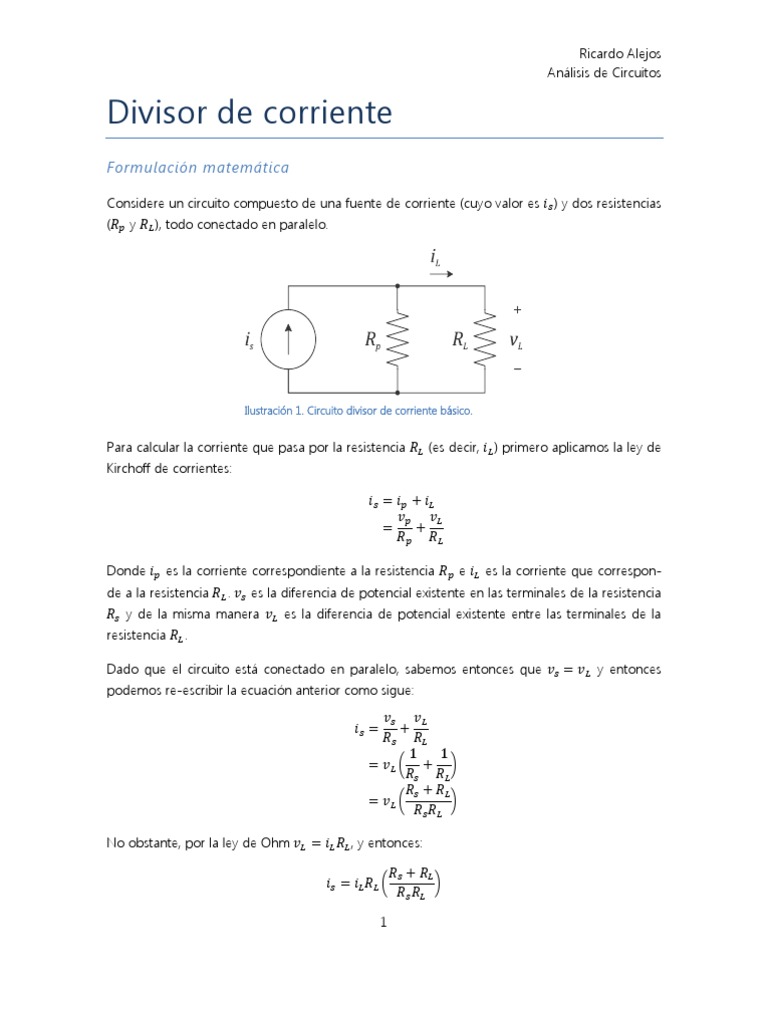 Para un circuito con te resistencias conectadas en paralelo a una fuente de corriente, la corrien(siendo y ) se puede calcular utilizanque corresponde a la resistencia