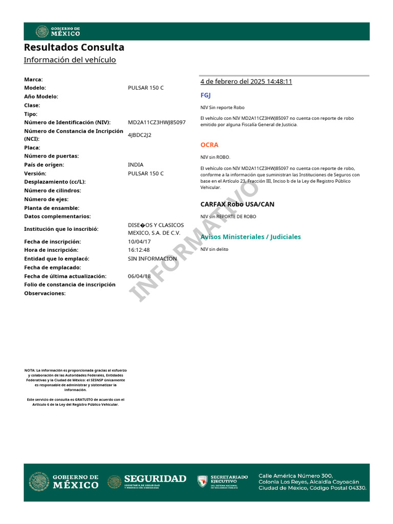 El vehículo con NIV MD2A11CZ3HWJ85097 no cuenta con reporte de robo