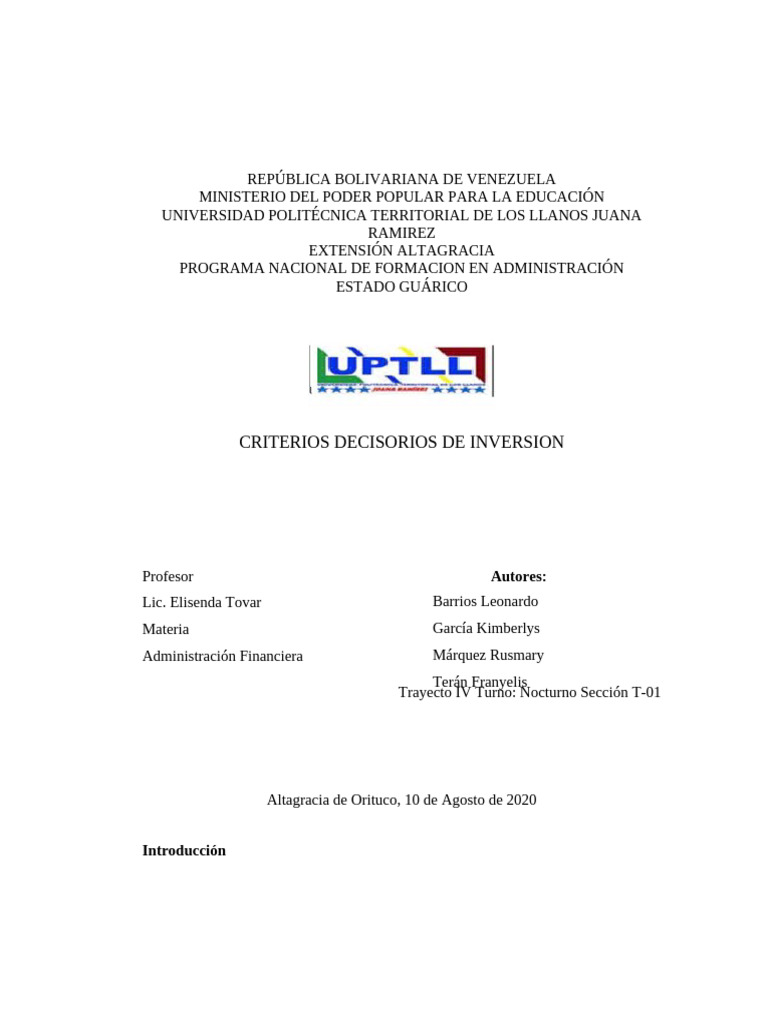 González Mileida (2019). Criterios decisorios de la inversión. [Documento en línea]