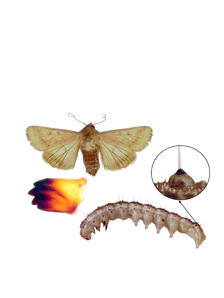 a) El adulto es una palomilla de color amarillo pajizo con una mancha oscura casi