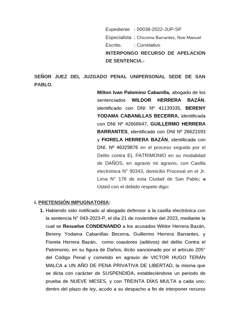 SEÑOR JUEZ DEL JUZGADO PENAL UNIPERSONAL SEDE DE SAN