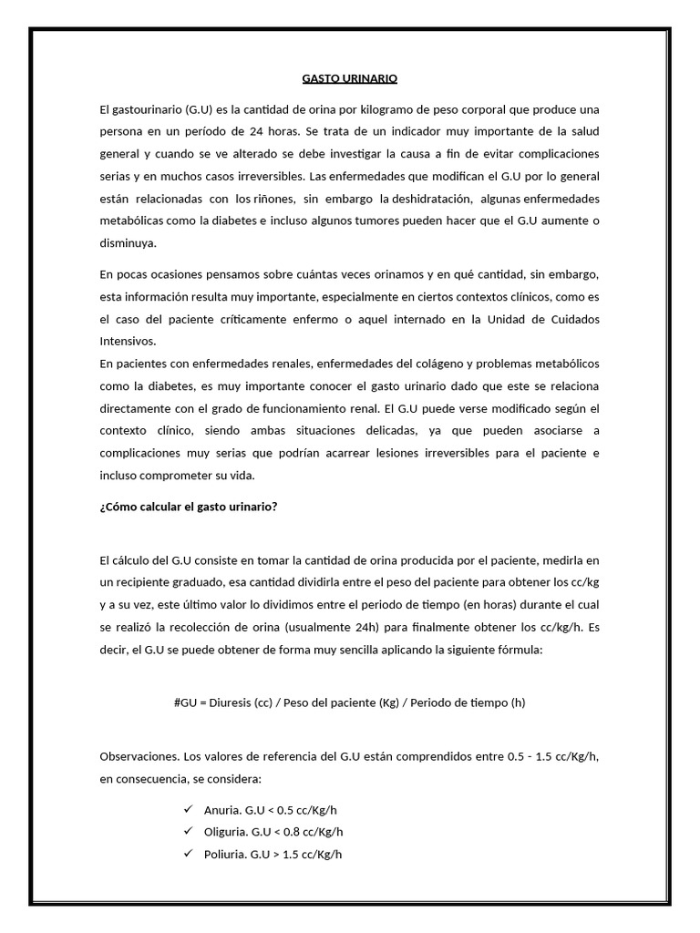 El cálculo del G.U consiste en tomar la cantidad de orina producida por el paciente, medirla en
