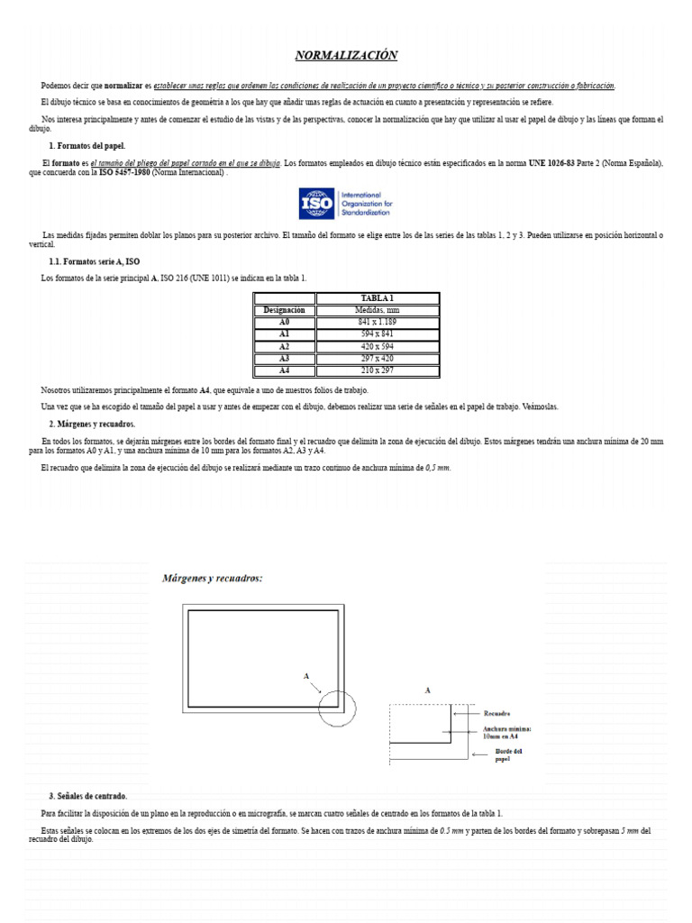 Nos interesa principalmente y antes de comenzar el estudio de las vistas y de las perspectivas, conocer la normalización que hay que utilizar al usar el papel de dibujo y las líneas que forman el