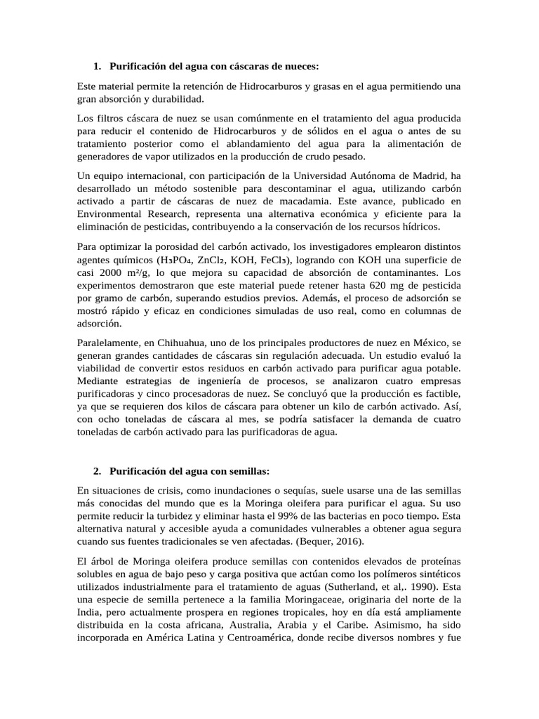 cáscaras de nueces y semillas en la purificación del agua es una alternativa de bajo