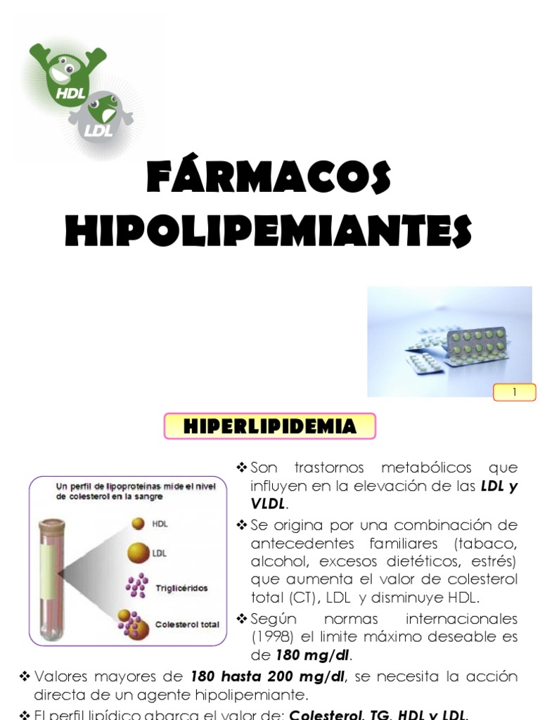 FRMACOS HIPOLIPEMIANTES Disminuyen la tasa normal de lpidos, especialmente el colesterol LDL.
