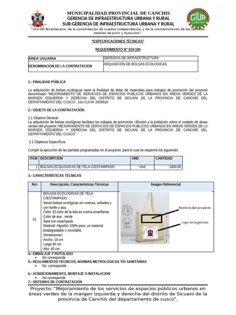La adquisición de bolsas ecológicas tiene la finalidad de dotar de materiales para trabajos de promoción del proyecto