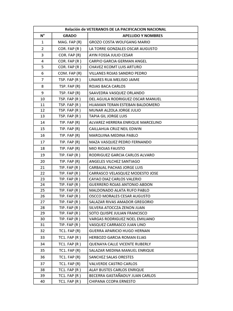 Relación de VETERANOS DE LA PACIFICACION NACIONAL