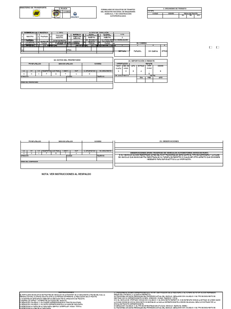 8, SEÑALE CON UNA EQUIS (X) EL TIPO DE TRACCIÓN QUE UTILIZA EL VEHÍCULO, (ORUGA, LLANTAS) 22.EN CASO DE TRASPASO, TRANSCRIBA LOS DATOS PERSONALES DEL NUEVO PROPIETARIO, SEÑALE CON UNA EQUIS (X) EL TIPO DE DOCUMENTO