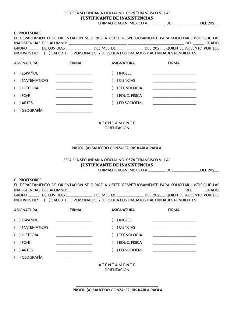 EL DEPARTAMENTO DE ORIENTACION SE DIRIGE A USTED RESPETUOSAMENTE PARA SOLICITAR JUSTIFIQUE LAS