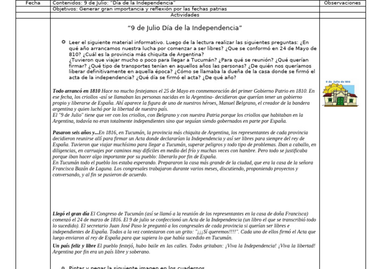 Fecha Contenidos: 9 de Julio: “Día de la Independencia” Observaciones