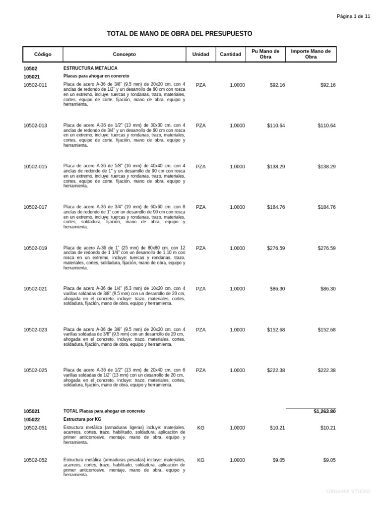 10502-055 Estructura metálica: placas base, columnas, placas de anclaje KG 1.0000 $7.82 $7.82