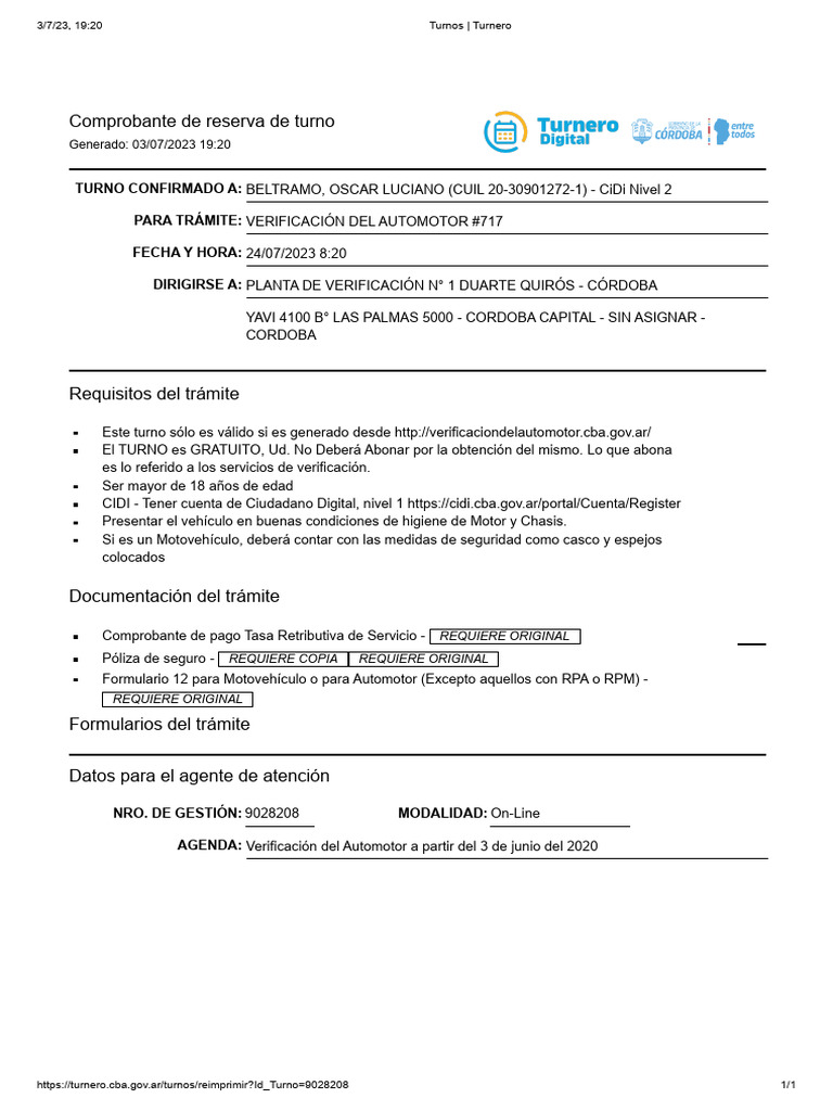 TURNO CONFIRMADO A: BELTRAMO, OSCAR LUCIANO (CUIL 20-30901272-1) - CiDi Nivel 2