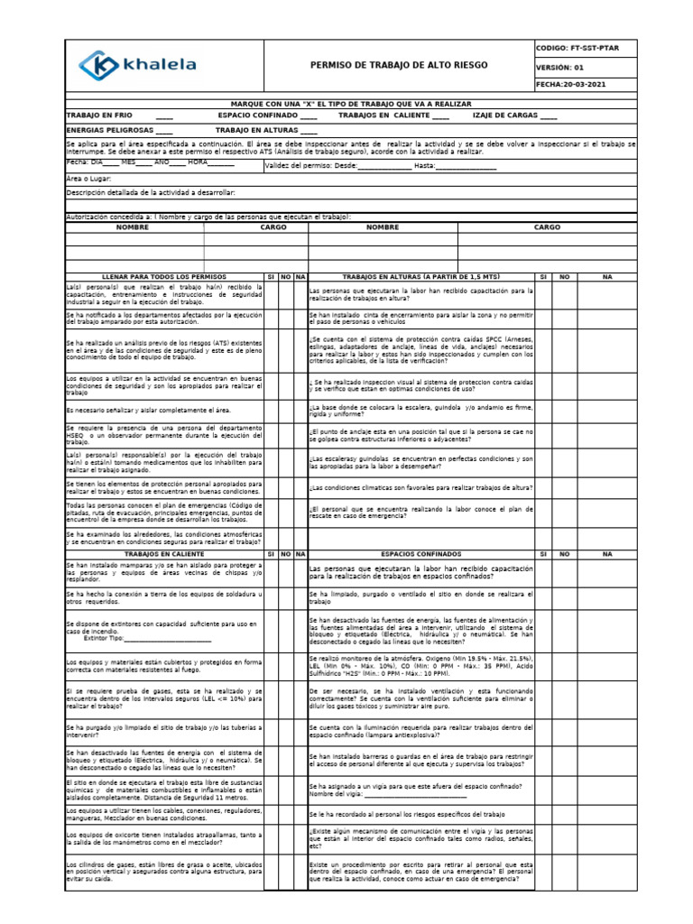 interrumpe. Se debe anexar a este permiso el respectivo ATS (Análisis de trabajo seguro), acorde con la actividad a realizar.