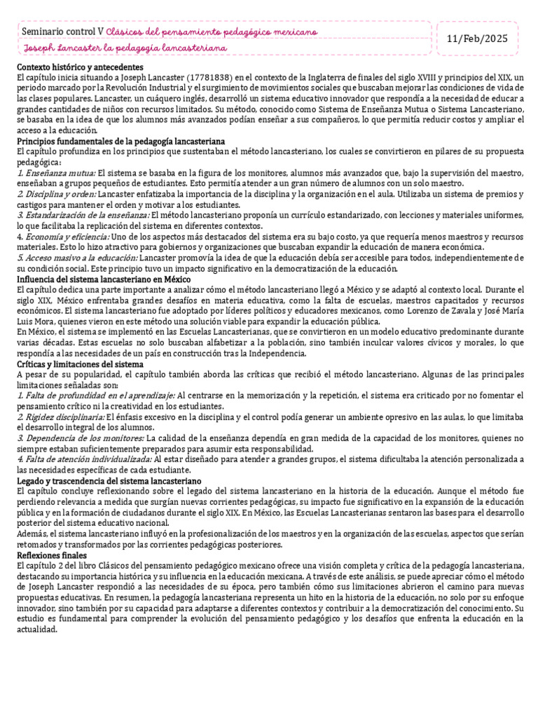 El capítulo 2 del libro Clásicos del pensamiento pedagógico mexicano ofrece una visión completa y crítica de la pedagogía lancasteriana,