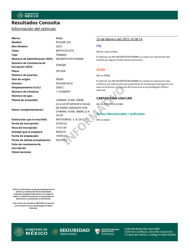El vehículo con NIV MD2B97FX3PCH00886 no cuenta con reporte de robo