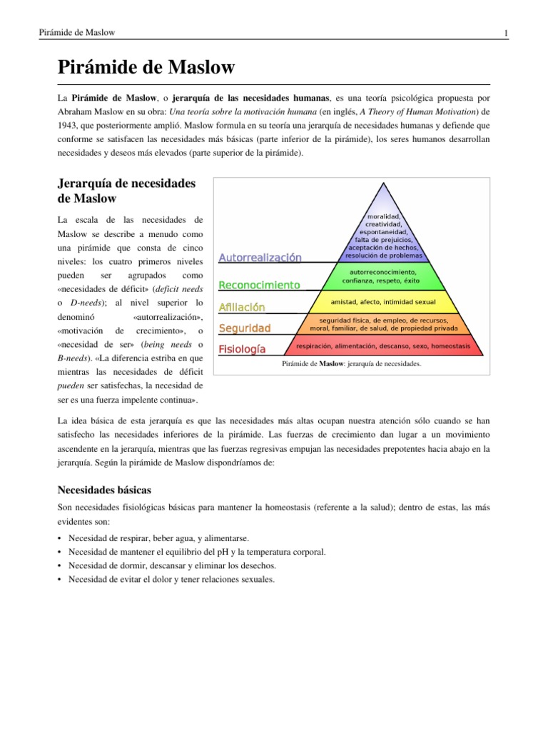 La Pirmide de Maslow, o jerarqua de las necesidades humanas, es una teora psicolgica propuesta por Abraham Maslow en su obra: Una teora sobre la motivacin humana (en ingls, A Theory of Human Motivation) de 1943, que posteriormente ampli. Maslow formula en su teora una jerarqua de necesidades humanas y defiende que conforme se satisfacen las necesidades ms bsicas (parte inferior de la pirmide), los seres humanos desarrollan necesidades y deseos ms elevados (parte superior de la pirmide).