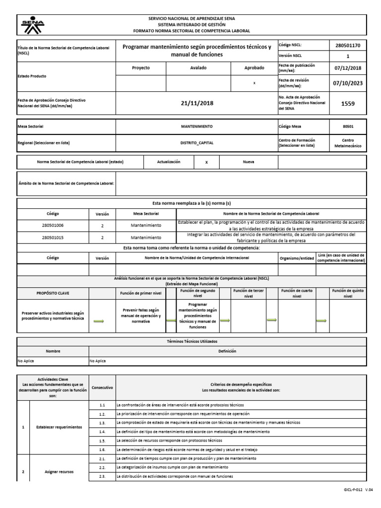 Título de la Norma Sectorial de Competencia Laboral Programar mantenimiento según procedimientos técnicos y