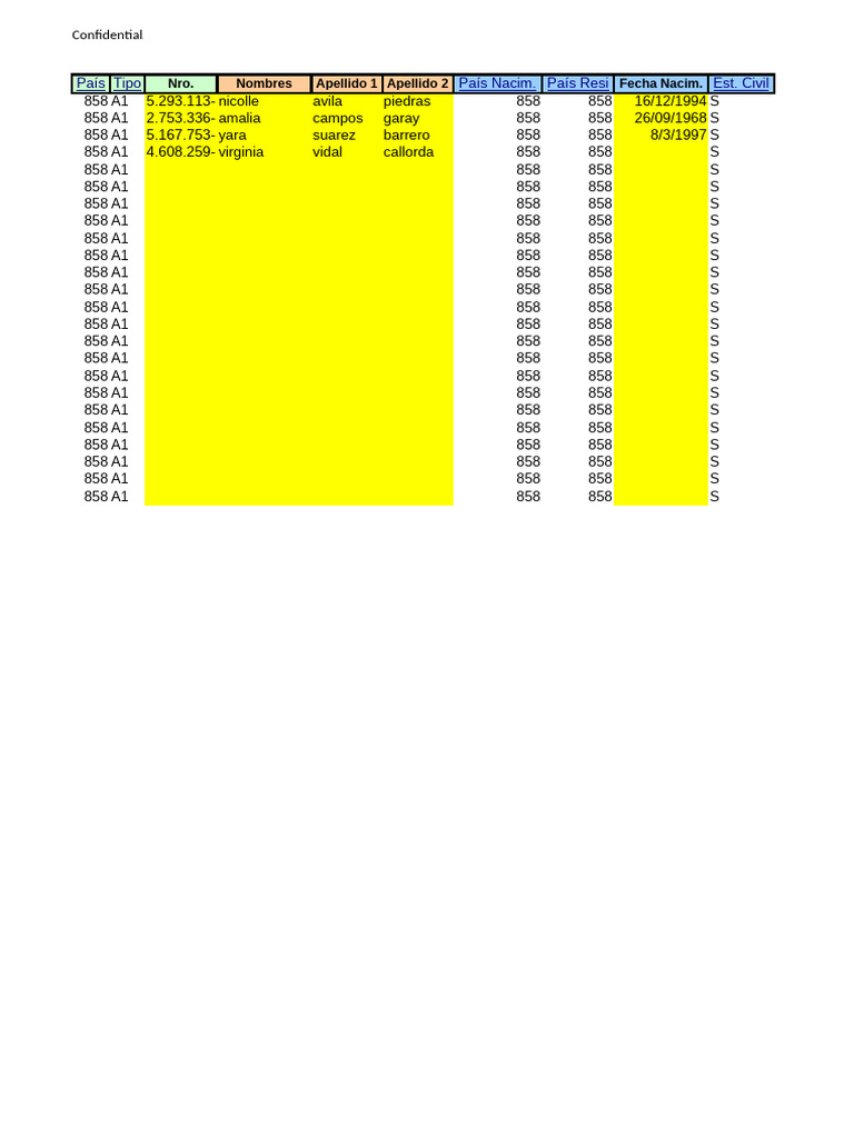 País Tipo Nro. Nombres Apellido 1 Apellido 2 País Nacim. País Resi Fecha Nacim. Est. Civil