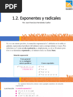 El documento aborda las leyes de exponentes y radicación, incluyendo definiciones y teoremas fundamentales como la multiplicación y división de bases iguales, así como el manejo de exponentes cero y negativos. También se presentan propiedades auxiliares y ejemplos prácticos para ilustrar la simplificación de expresiones algebraicas. Se menciona la importancia de entender estas leyes para resolver problemas matemáticos relacionados con potencias y raíces.