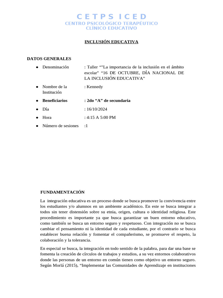 ● Denominación : Taller “"La importancia de la inclusión en el ámbito