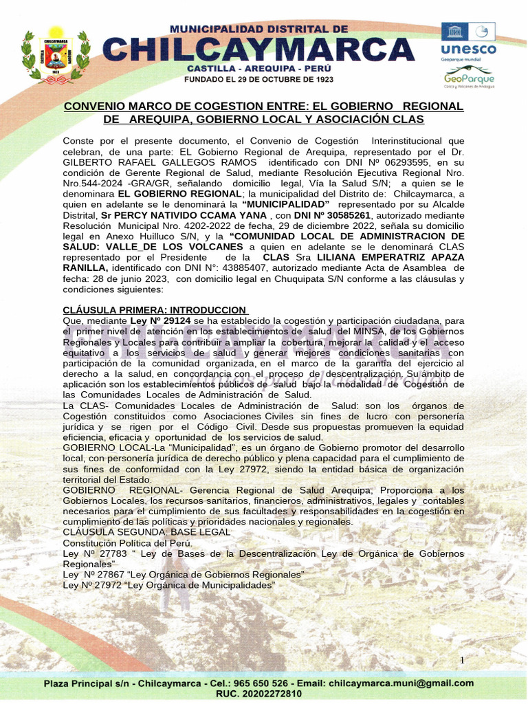 fecha: 28 de junio 2023, con domicilio legal en Chuquipata S/N conforme a las cláusulas y