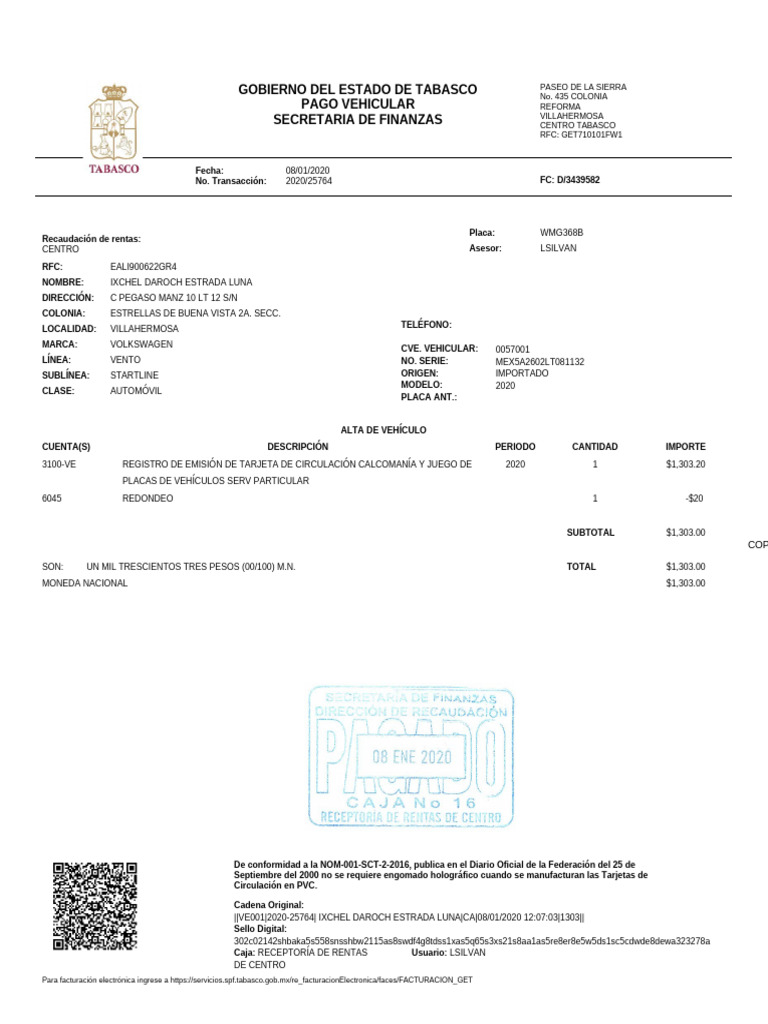 ||VE001|2020-25764| IXCHEL DAROCH ESTRADA LUNA|CA|08/01/2020 [Link]|1303||