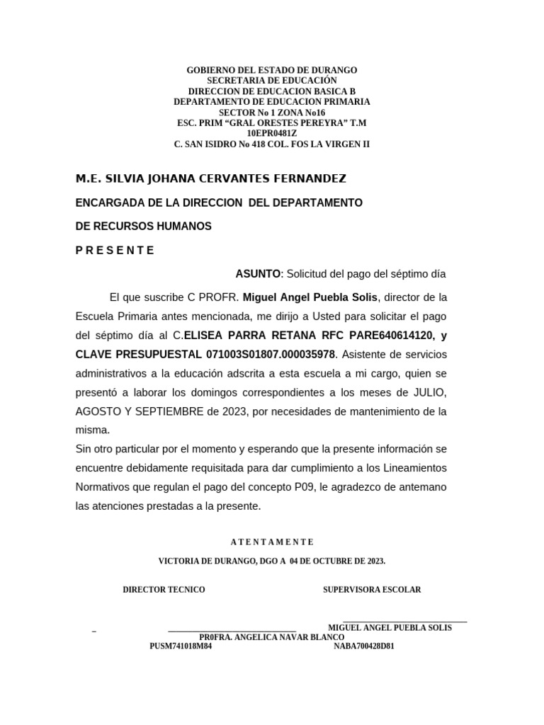 Escuela Primaria antes mencionada, me dirijo a Usted para solicitar el pago