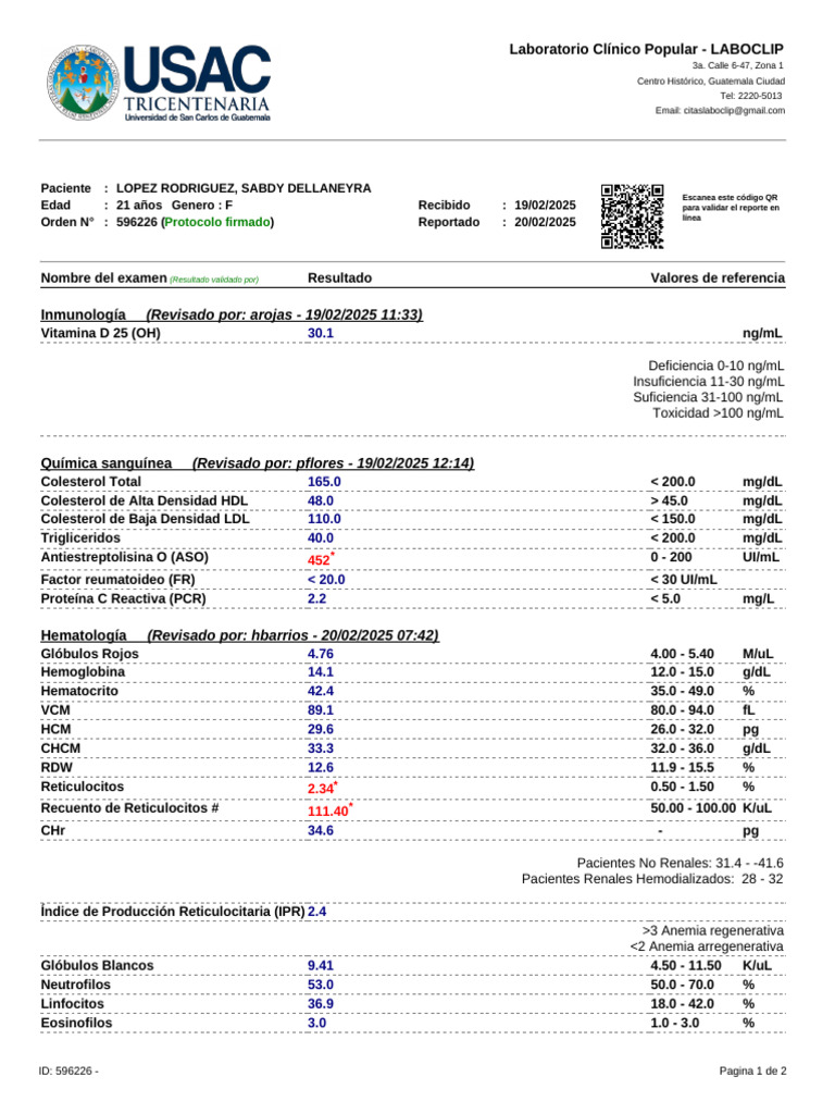 Edad : 21 años Genero : F Recibido : 19/02/2025 para validar el reporte en