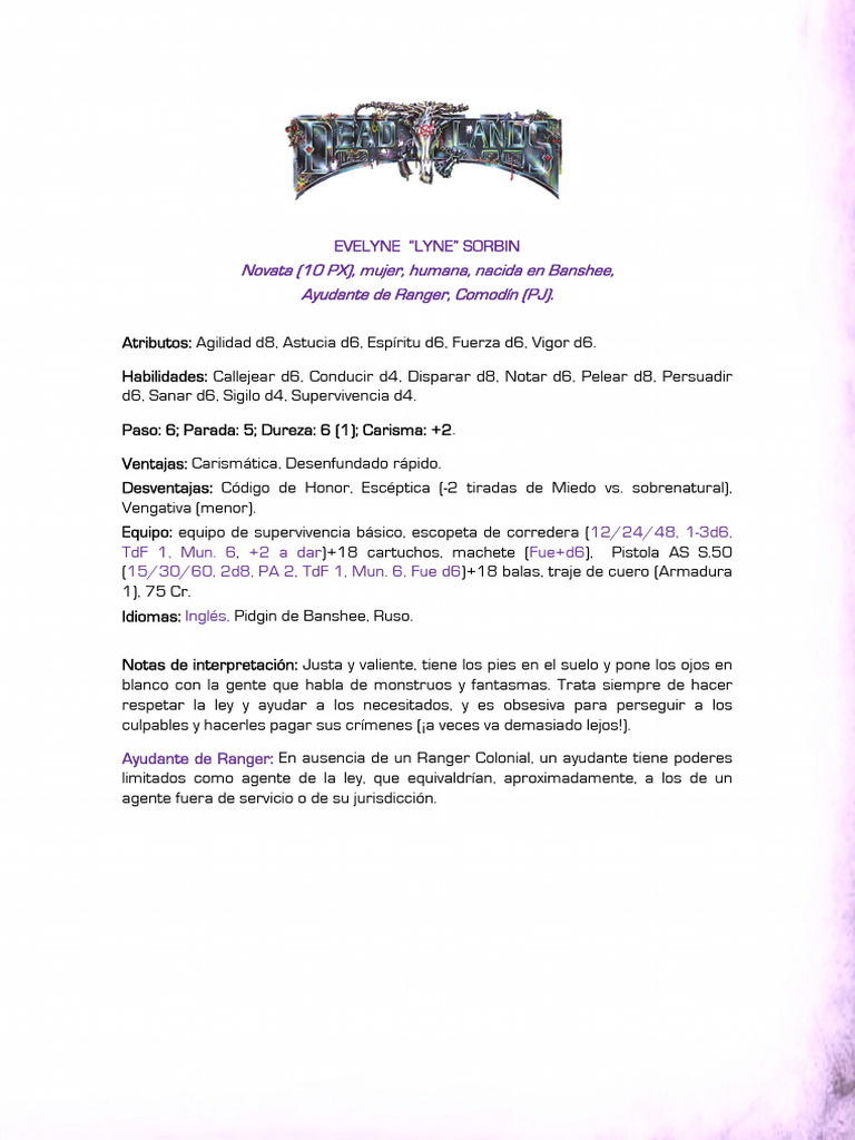 Habilidades: Notar d8, Montar d6, Disparar d6, Pelear d6, Rastrear d8, Sigilo d6,
