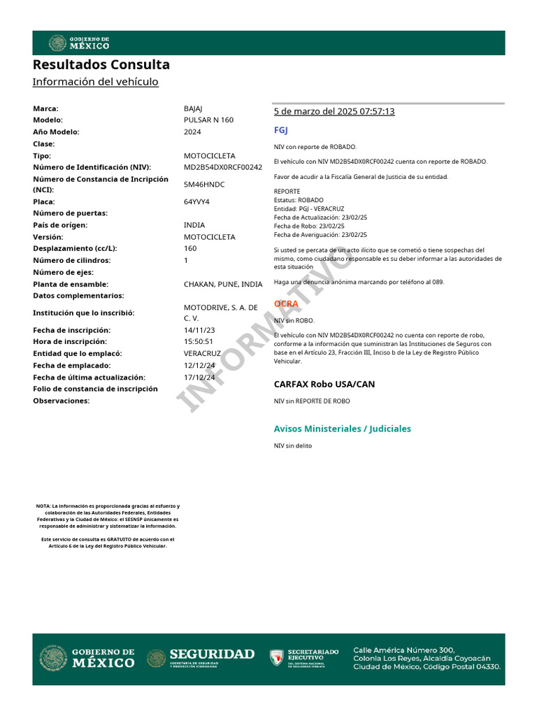 El vehículo con NIV MD2B54DX0RCF00242 no cuenta con reporte de robo,