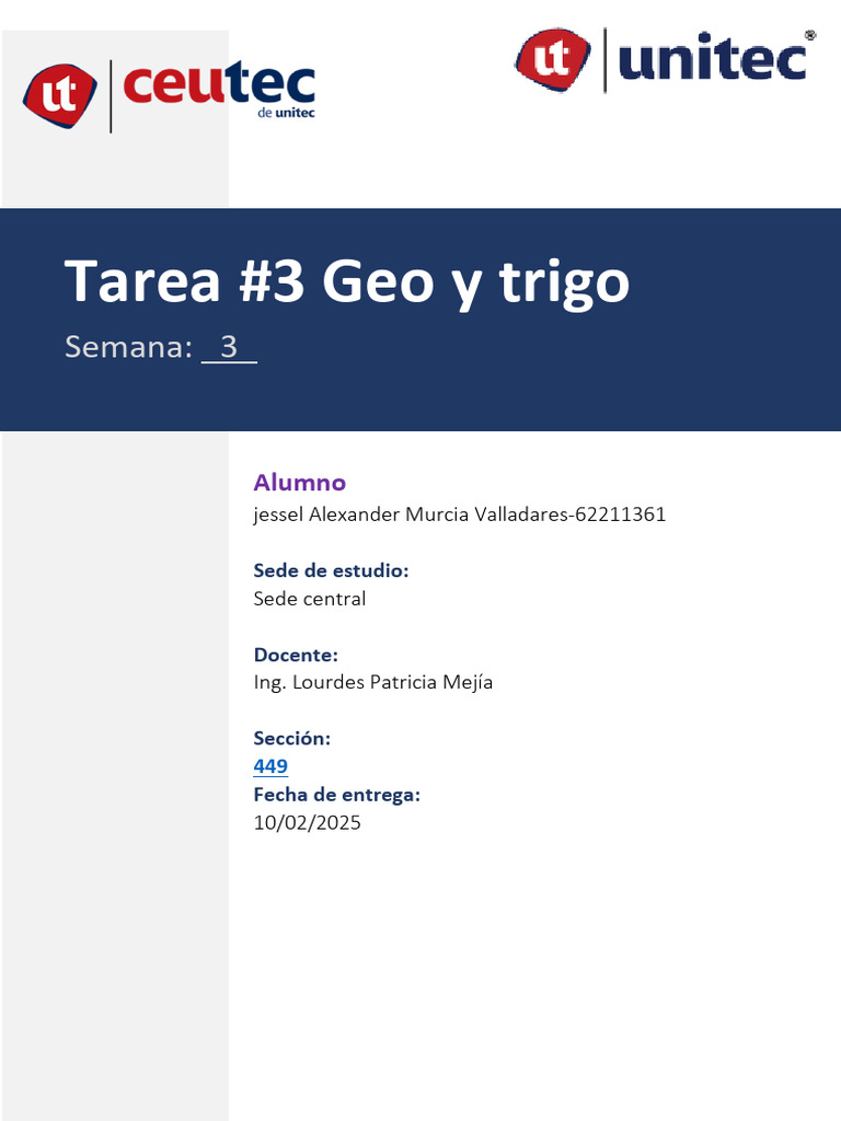 La tarea #3 de Geo y Trigo está asignada al alumno jessel Alexander Murcia Valladares, con número de estudiante 62211361. La tarea debe ser entregada el 10 de febrero de 2025 y es supervisada por la docente Ing. Lourdes Patricia Mejía en la sede central, sección 449.