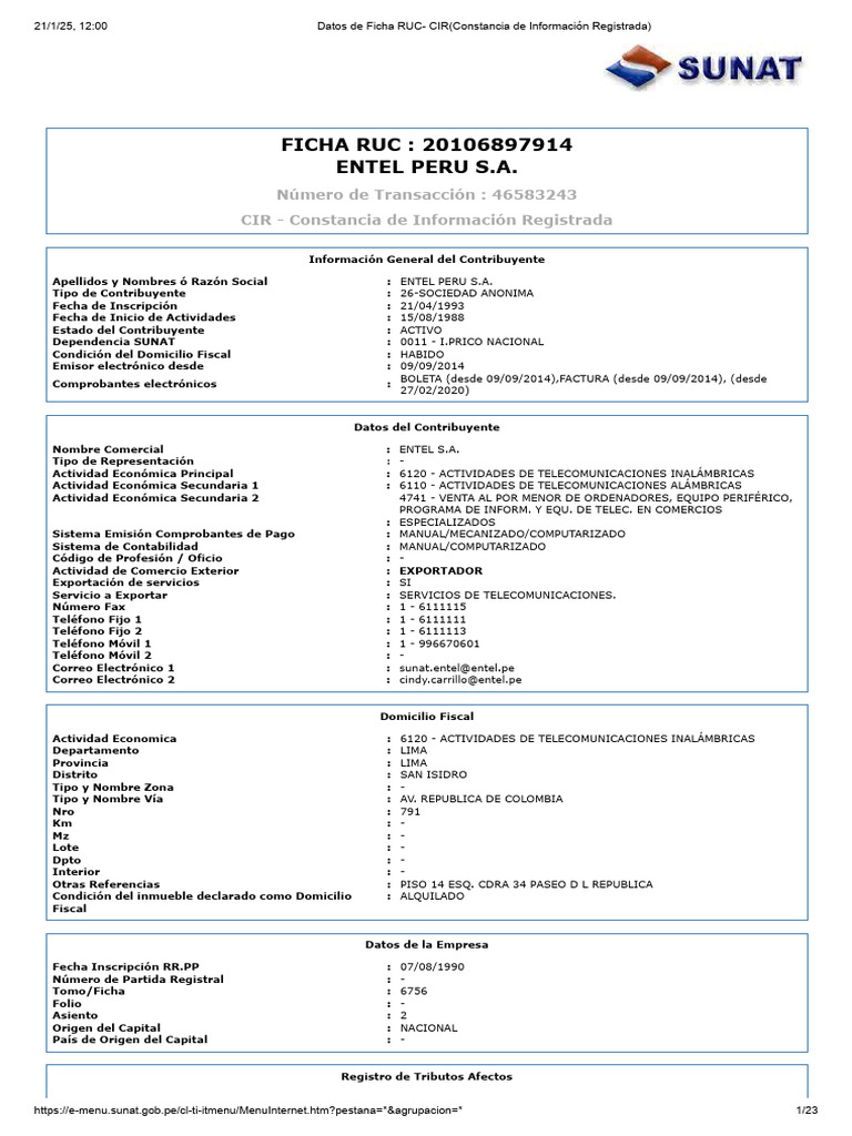 21/1/25, 12:00 Datos de Ficha RUC- CIR(Constancia de Información Registrada)