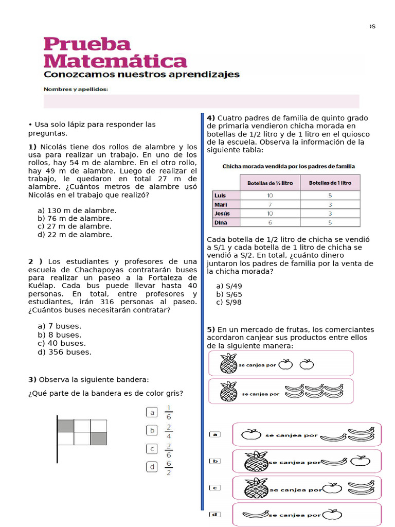 • Usa solo lápiz para responder las de primaria vendieron chicha morada en