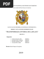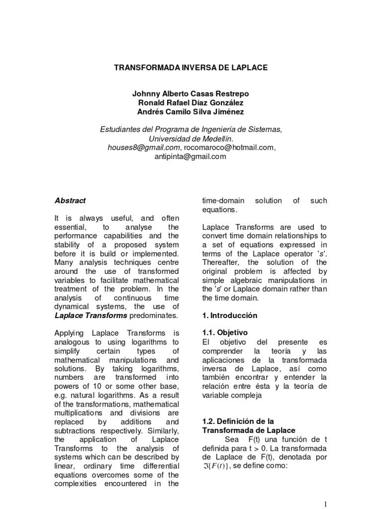 Laplace Transforms are used to convert time domain relationships to a set of equations expressed in terms of the Laplace operator 's'. Thereafter, the solution of the original problem is affected by simple algebraic manipulations in the 's' or Laplace domain rather than the time domain. 1. Introduccin 1.1. Objetivo El objetivo del presente es comprender la teora y las aplicaciones de la transformada inversa de Laplace, as como tambin encontrar y entender la relacin entre sta y la teora de variable compleja 1.2. Definicin de la Transformada de Laplace Sea F(t) una funcin de t definida para t > 0. La transformada de Laplace de F(t), denotada por {F (t )} , se define como:
