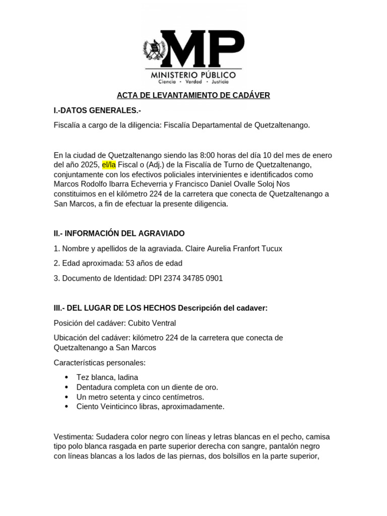 del año 2025, el/la Fiscal o (Adj.) de la Fiscalía de Turno de Quetzaltenango,