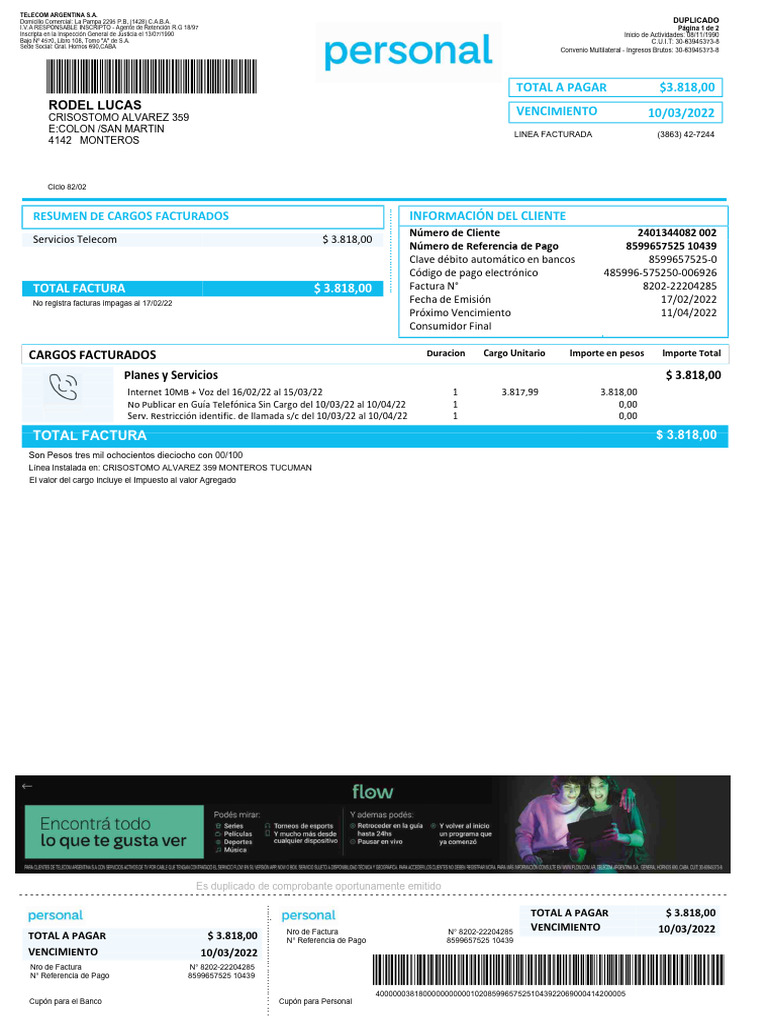 Internet 10MB + Voz del 16/02/22 al 15/03/22 1 3.817,99 3.818,00