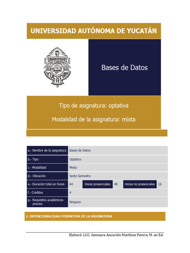 a.- Nombre de la asignatura Bases de Datos