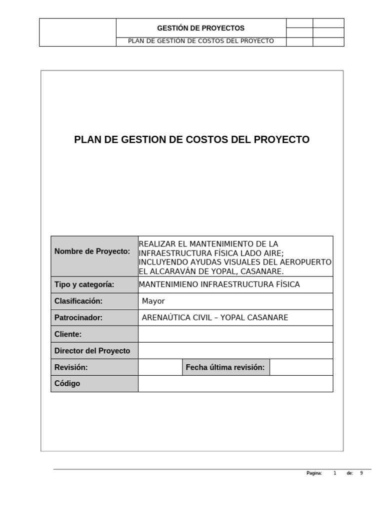 1.1. PROPÓSITO DEL PLAN DE GESTIÓN DE COSTOS
