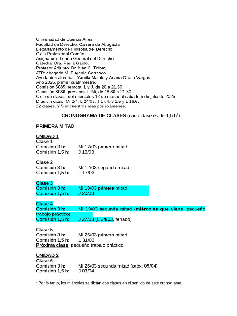 Por lo tanto, los miércoles se dictan dos clases en el sentido de este cronograma.