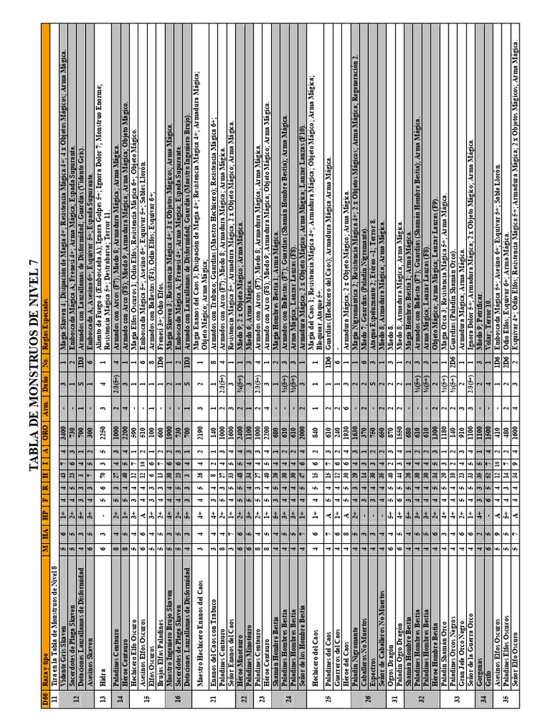TABLA DE MONSTRUOS DE NIVEL 7